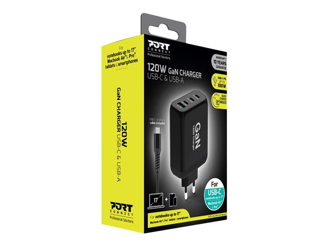 Le chargeur GaN 900107 de PORT Connect permet de recharger un ordinateur portable jusqu'à 17", et 3 appareils supplémentaires. Gagnez en efficacité, praticité et économisez avec la technologie Nitrure de Gallium (GaN) qui est plus efficace, plus petite, plus légère et moins énergivore que les chargeurs traditionnels au silicium. Ses ports USB-C & USB-A permettent de recharger vos appareils jusqu'à 120 W. Emportez le partout grâce à son design compact et léger. Un câble USB-C vers USB-C de 2 mètres est inclus avec le chargeur pour vous permettre d'y connecter vos appareils.