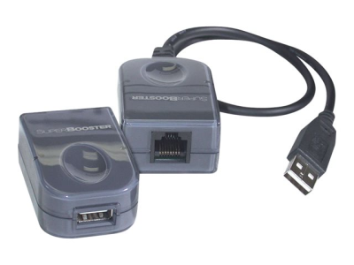 Ce périphérique Plug and Play se compose d'une unité de base et d'une unité distante connectées ensemble par un câble réseau Cat5, Cat5E ou Cat6 standard (non fourni). Connectez simplement vos câbles à votre périphérique, puis connectez votre ordinateur et votre périphérique USB et vous êtes prêt à les utiliser. Étant donné qu'il est alimenté par bus, il ne nécessite aucune source d'alimentation externe. Au contraire, le superbooster dispose d'une alimentation CC interne qui conditionne les circuits à maintenir la tension adéquate sur l'appareil distant afin qu'aucune alimentation externe ne soit nécessaire ni pour la base ni pour l'unité distante. Conforme à la spécification USB 1.1.