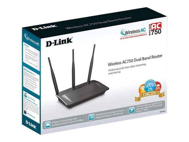 Le routeur bibande Wireless AC750 DIR-809 est une solution de réseau sans fil abordable, mais puissante, qui combine la dernière norme Wi-Fi haut débit 802.11ac avec la technologie bibande et des ports Fast Ethernet pour une mise en réseau optimale.