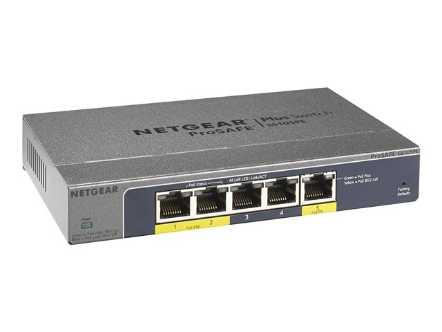 NETGEAR Plus GS105PE - Commutateur - Géré - 2 x 10/100/1000 (PoE+) + 3 x 10/100/1000 - de bureau - PoE+ (19 W)